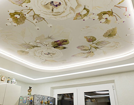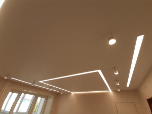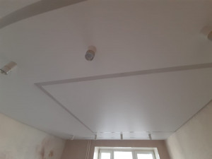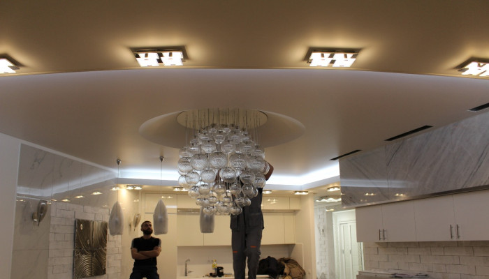 Установка многоуровневого потолка обычно происходит в два этапа. В первый день устанавливается каркас потолка, устанавливаются закладные под освещение, к стенам крепится багет. После изготовления формы каркаса и согласования его с клиентом, потолок снова замеряется. На следующий день полотно выкраивается, а затем устанавливается.