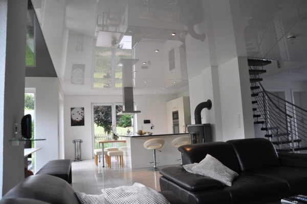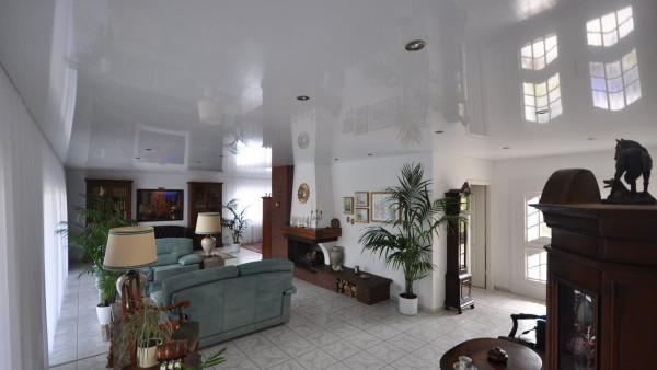 Натяжной потолок является одним из лучших вариантов отделки для гостиной. Его полотна имеют привлекательный и элегантный внешний вид и при этом являются прочными и износостойкими. С помощью натяжного потолка можно замаскировать многие неровности и трещины, не проводя дополнительной шпаклевки или грунтовки. Монтаж данного отделочного материала не потребует много времени – с работой можно справится за считаные часы.