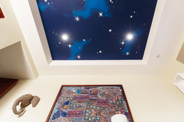 Натяжные потолки с имитацией ночного звездного неба способны создать уютную атмосферу в любом помещении. Технология предусматривает размещение небольших светодиодных лампочек по всей площади полотна. Они напоминают естественное расположение звезд на небе, благодаря чему создается очень реалистичный эффект. Натяжные потолки звездное небо с установкой в спальне или детской комнате могут выполнить роль дополнительной подсветки или ночника в темное время суток. Днем лампочки не видны, поэтому потолочное покрытие кажется однотонным.