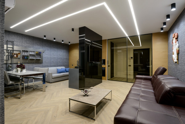 Световые линии на натяжном потолке могут иметь разный дизайн. Это могут быть простые прямые линии либо сложные геометрические узоры. Здесь все зависит от фантазии дизайнера или владельца помещения, размеров потолочного покрытия, а также стиля, который использован в основном интерьере. Довольно часто такие линии в потолке выполняют роль «перегородок», отделяя одну зону комнаты от другой. Это очень удобно, если вы не хотите строить в помещении дополнительные стенки.