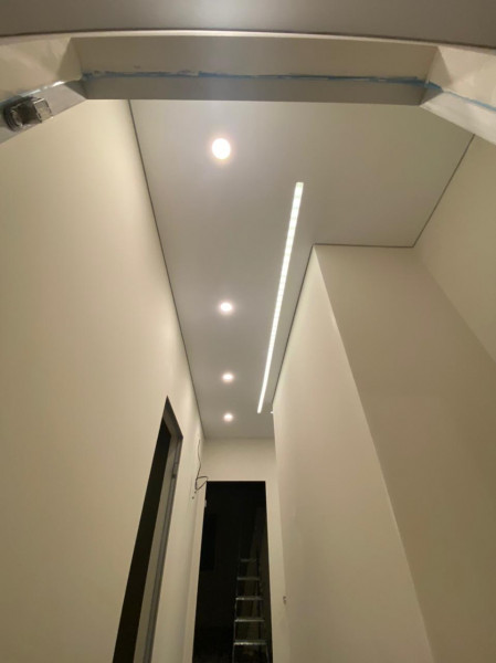- После того, как проект размещения световых линий на натяжном потолке готов, мастер приступает к установке специальных профилей. Именно в них в последующем будут вмонтированы линии.